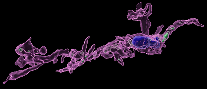 Peer-Reviewed PublicationIMAGE: A MICROGLIA (IN MAGENTA) FROM A MALE MOUSE BORN TO A MOM ON A HIGH-FAT DIET, WHICH SEQUESTERS MORE BRAIN SEROTONIN (IN GREEN) THAN MALES WITH MOM’S EATING A TYPICAL LAB DIET. THE BLUE IS THE GLIA’S NUCLEUS. view more