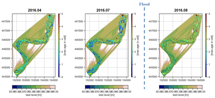After conducting a modelling for the past data(2012-2019 period), the results were compared with the observed data. Compared with the ratio of coverage of tree species in the land cover map made with aerial photos, the area fraction of willow trees in the model result had similar coverage ratio (In 2014, actual : 2.02%, model : 2.21%). In 2016, the model adequately reproduced the actual situation by simulating the survival and growth of vegetation in the spring and the mortality of vegetation after the flood.