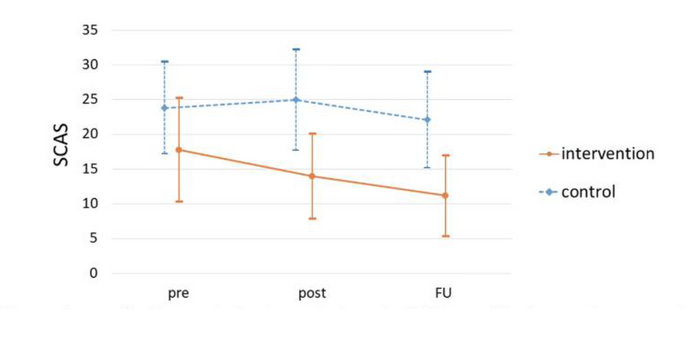 The findings suggested a statistically significant reduction in the SCAS scores during the 2-month follow-up period, as well as a reduction in the SDQ scores. These findings suggest that the children benefitted from the CBT-based program when it was delivered in a short and divided format.