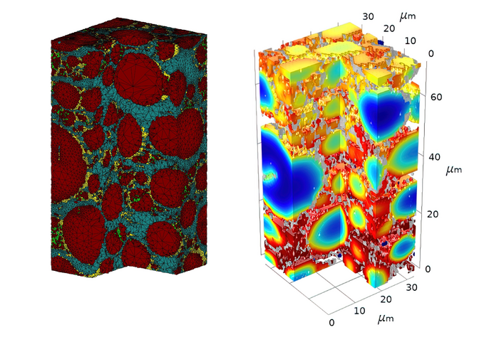 Peer-Reviewed PublicationIMAGE: PME RESEARCHERS COLLECTED DATA ON HOW DIFFERENT COMPONENTS OF A THICK LITHIUM ION BATTERY ELECTRODE EVOLVE AFTER SUCCESSIVE CYCLES (ONE SNAPSHOT OF THE MICROSCOPY DATA SHOWN ON THE LEFT). THEN, THEY USED THIS DATA TO CREATE A COMPUTATIONAL MODEL (RIGHT) ILLUSTRATING THE DEGRADATION AND POINTING TOWARD HOW TO IMPROVE THE LIFESPAN OF THE BATTERIES. view more