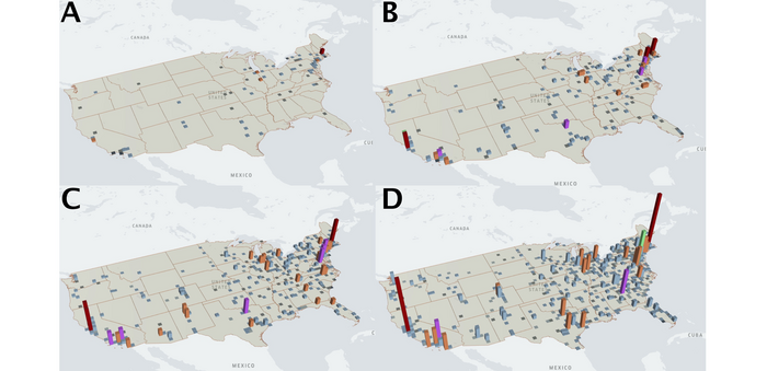 IMAGE: REGIONAL EVOLUTION OF THE NUMBER OF IN-FLOWING RESEARCHERS INTO THE FIELD OF SEMICONDUCTORS IN THE US (HEIGHT OF BARS). PANELS A–D CORRESPOND TO TIME PERIODS 1954–1970, 1970–1986, 1986–2002, AND 2002–2020, RESPECTIVELY. view more