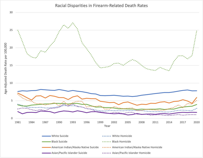 These findings suggest that efforts to prevent firearm suicides and homicides should account for the demographics of people most impacted. The researchers also note that their study highlights the urgency of such efforts and that dismantling structural racism in the U.S. is necessary to address the disparities they found.