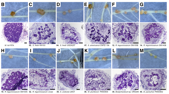 Peer-Reviewed PublicationIMAGE: A PORTION OF FIGURE 3 FROM THE STUDY, DEPICTING NODULE HISTOLOGY WITH REPRESENTATIVE IMAGES OF PINK NODULES DEVELOPED ON L. BURTTII BY DIFFERENT RHIZOBIAL STRAINS. view more