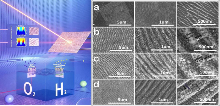 IMAGE: THE SCHEMATIC OVERVIEW ILLUSTRATES THE LIPSS FABRICATION METHOD ON NI FOAM USING FEMTOSECOND LASER TREATMENT AND THE ENHANCEMENT OF HYDROGEN AND OXYGEN GENERATION VIA FIELD LOCALIZATION (LEFT SIDE). THE SURFACE MORPHOLOGY OF THE LIPSS PATTERNED NI FOAM ELECTRODES (RIGHT SIDE). view more