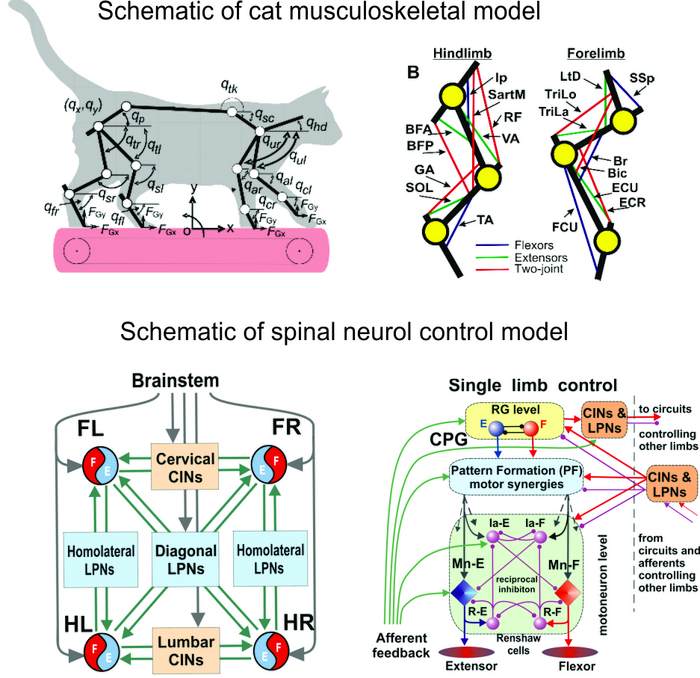 With these Canadian lab experiments, the researchers at Georgia Tech and Drexel University are using observations to develop a computational model of the cat’s musculoskeletal and spinal neural control systems. The data gathered are used to compute somatosensory signals related to length, velocity, and produced force of muscles, as well as pressure on the skin in all limbs. This information forms motion sensations in the animal’s spinal cord and contributes to interlimb coordination by the spinal neuronal networks.