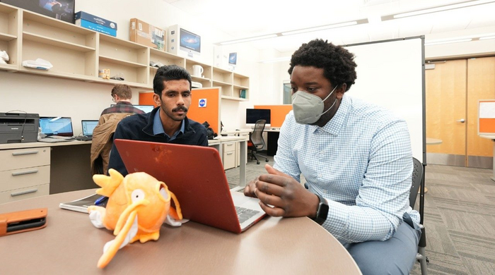 Grant and Award AnnouncementIMAGE: MASTER'S STUDENT EDWIN GEORGE (AT LEFT) DISCUSSES THE SPECIFICS OF RESEARCH WITH ASSISTANT PROFESSOR JOHN PALMORE. PHOTO BY ALEX PARRISH FOR VIRGINIA TECH. view more