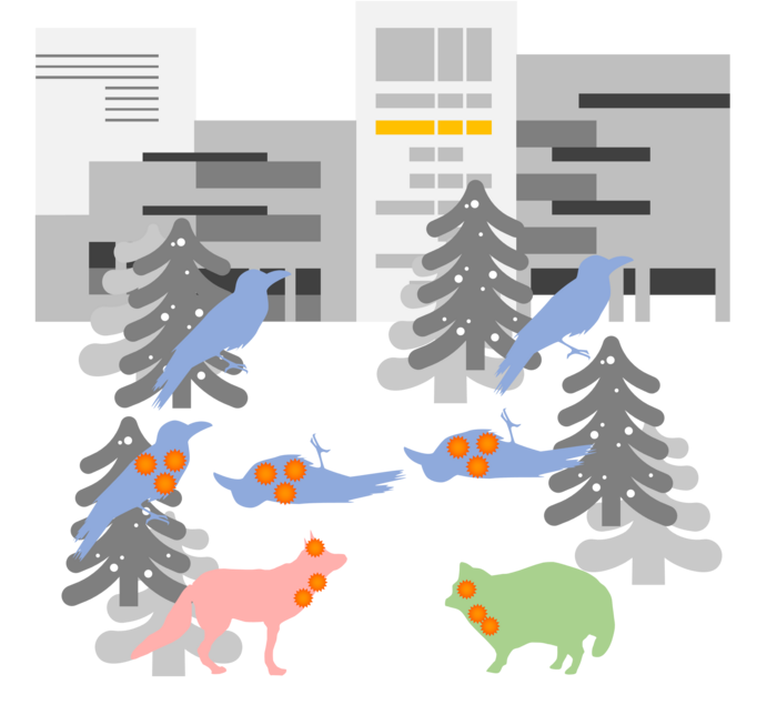 IMAGE: WHEN THE H5N1 HPAI VIRUS (ORANGE) AFFECTED A FLOCK OF CROWS IN A PUBLIC GARDEN, IT CAUSED A MASS DIE-OFF OF CROWS. AN EZO RED FOX AND A JAPANESE RACCOON DOG WERE ALSO INFECTED BY THE H5N1 HPAI VIRUS, THE FORMER LIKELY BY CONSUMING CORPSES OF THE CROWS, AND THE LATTER DUE TO CLOSE CONTACT WITH CROW CORPSES (ILLUSTRATION: TAKAHIRO HIONO). view more