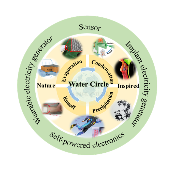The review covers the main mechanisms of electricity production for bio-inspired water-driven generators. It also offers a tour d’horizon of the various bio-inspired devices that have been developed, specifically evaporation, moisture, rainwater, and wave and flow-driven generators, covering three use cases: sensors, wearable electricity generators, and self-powered electronics.