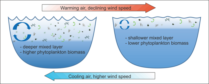 Climatic drives such as wind speed and temperature difference between air and water regulate the depth of the mixed layer. During heatwaves, warm and calm weather reduces the depth of the mixed layer, whereas colder and windy weather deepens the mixed layer. Warming climate will increase heatwaves and thus the conditions that can reduce phytoplankton biomass in lakes.