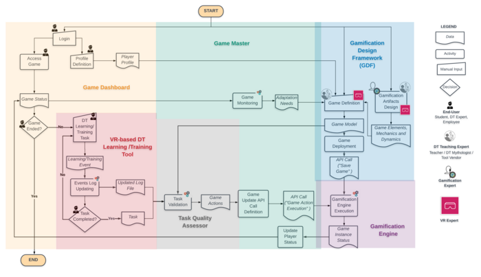 This study proposes the integration of VR and gamification mechanisms to enable DT students and employees to experience quality learning and training experiences. This technology will be multi-purpose and suitable for different uses, including lesson planning and instruction. The gamification element will enhance learner motivation and make the entire experience more enjoyable. This benefits the learning process by enabling learners to acquire knowledge and create a favorable learning environment. We discussed the required components and necessary interconnections to adequately assemble and obtain the resulting gamified modeling tool. We highlighted some relevant issues that should be addressed in future research: the definition of a repository for learning experiences, the realization of techniques required to adapt and personalize user feedback, and the implementation of approaches for personalized and cooperative learning in the DT domain.