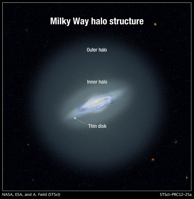 GuhaThakurta explained that the stellar halo component of our galaxy is much bigger than the disk, which is about 100,000 light years across. Our solar system resides in one of the spiral arms of the disk. In the middle of the disk is a central bulge, and surrounding it is the halo, which contains the oldest stars in the galaxy and extends for hundreds of thousands of light years in every direction.