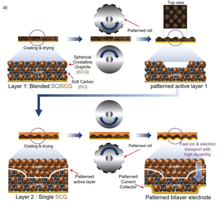 In order to develop a design and process technology that maintains high performance and reliability even when the electrode of the lithium-ion battery is thick, the KIMM-SKKU joint research team formed a bilayered anode. Additionally, the anode is designed with grooves allowing small materials with improved ion conductivity and electrical conductivity to be placed between high-capacity materials