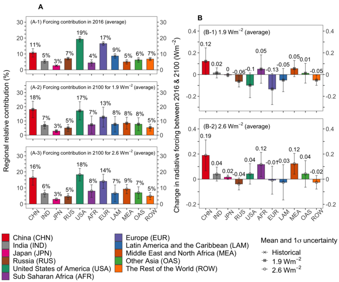 IMAGE: REGIONAL FORCING CONTRIBUTIONS IN 2016 UNDER THE HISTORICAL SCENARIO (A-1) AND IN 2100 UNDER THE 1.9 WM-2 (A-2) AND 2.6 WM-2 (A-3) SCENARIOS. PANEL B SHOWS THE FORCING CONTRIBUTIONS IN 2100 RELATIVE TO 2016 LEVELS UNDER THE 1.9 WM-2 (B-1) AND 2.6 WM-2 (B-2) SCENARIOS. THE VALUE ON TOP OF THE BAR INDICATES THE MEAN, AND THE ERROR BAR INDICATES THE ONE-SIGMA UNCERTAINTY OBTAINED FROM THE ENSEMBLE OF EMULATED CLIMATE MODELS. view more