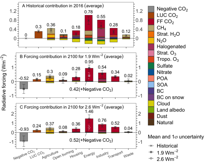 Different regions of the world and different sectors of activity emit various amounts of greenhouse gases and other air pollutants affecting climate change. Knowing the details of these contributions can help policy makers in deciding where to focus their efforts to meet their targets regarding the Paris Agreement. This treaty, signed in 2015, set goals to limit global warming well below 2°C and pursue efforts to limit the increase to 1.5°C above preindustrial levels, to avoid dangerous impacts of climate change. Different regions and sectors (i.e., energy, transportation, agriculture) emit different amounts of greenhouse gases and other air pollutants to the atmosphere. Each of these gases interacts with incoming and outgoing heat (or radiation) in different ways and together determine the amount of warming (or cooling) and climate change we experience. It is therefore important to understand how these interactions with heat or “radiative forcings” might change between regions and sectors over time so we can mitigate climate change effectively.