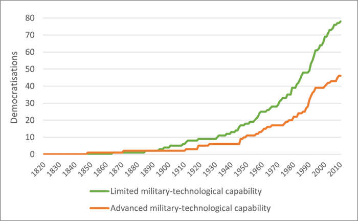 When autocratic rulers have access to modern arms that are both fast and accurate at long ranges, it allows them to suppress protests and riots more effectively and at a lower cost. Now a large study confirms that access to modern military technology substantially reduces the probability of democratisation of authoritarian regimes.