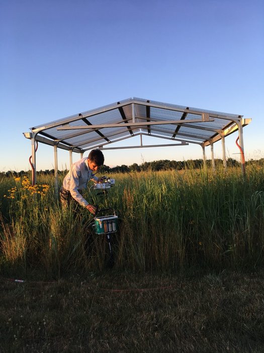 IMAGE: MICHIGAN STATE UNIVERSITY POSTDOCTORAL RESEARCHER MAURICIO TEJERA-NIEVES STUDIES SWITCHGRASS NEAR A RAINFALL EXCLUSION SHELTER BUILT BY THE GREAT LAKES BIOENERGY RESEARCHER CENTER AT MICHIGAN STATE’S W.K. KELLOGG BIOLOGICAL STATION LONG-TERM ECOLOGICAL RESEARCH SITE. view more
