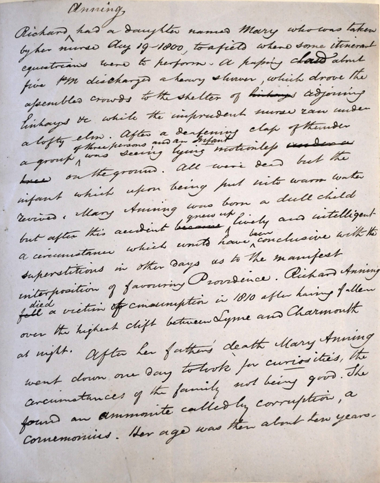 A page from the manuscript which includes details of Mary Anning being struck by lightning as a baby