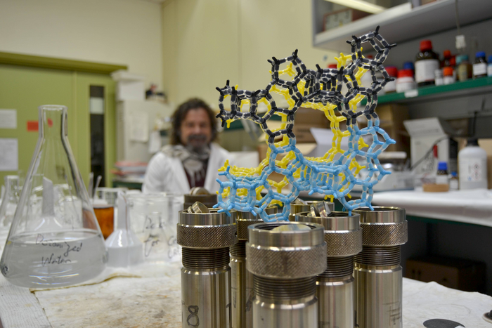 Miguel Camblor, ICMM-CSIC researcher, and a representation of the structure of ZEO-3. / ICMM-CSIC