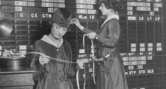 IMAGE: EMPLOYEES OF THE WALDORF-ASTORIA HOTEL OPERATING TICKERS AND STOCK EXCHANGE BOARDS, 1918. view more