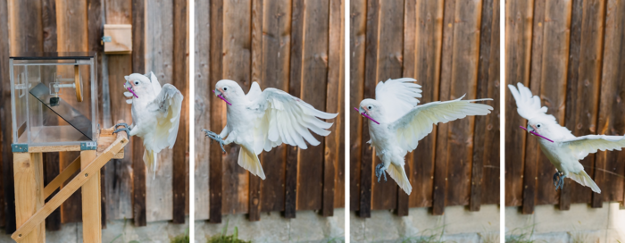 IMAGE: THIS IS A SERIES OF PHOTOS OF FIGARO THE GOFFIN'S COCKATOO FLYING WHILE CARRYING A SET OF TWO TOOLS TOWARDS A BOX CONTAINING A CASHEW. view more