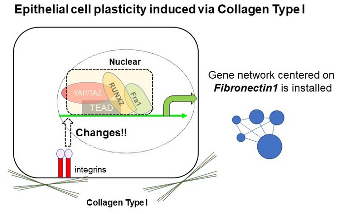 “The results showed that culturing in collagen induced the expression of inflammation-associated and fetal-like genes in both human and mouse intestinal cells,” explains Shiro Yui, senior author. “As previously reported, the YAP/TAZ-TEAD axis definitely plays a central role in the induction of this distinctive gene expression signature, but this time we identified the cooperative transcriptional activity of Fra1 and RUNX2 in the process, which hammers the gene network centered on Fibronectin.”