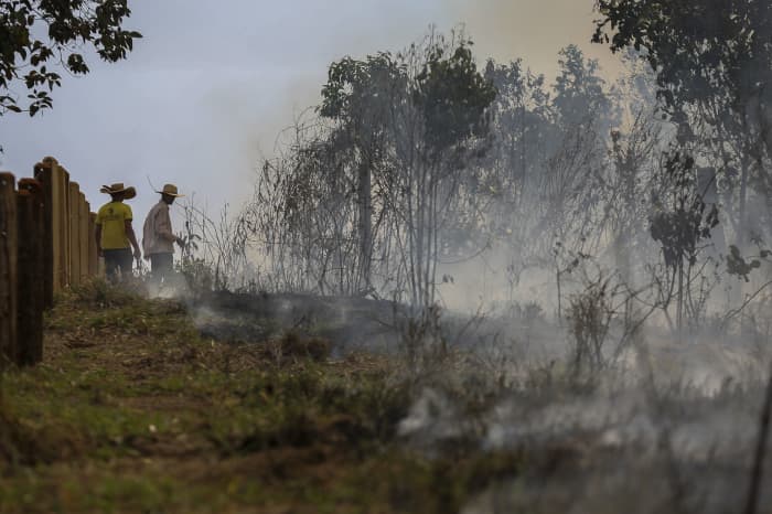 Men are seen on a burnt area of the Amazon rainforest in Apui, Brazil, last fall. According to one measure, hotspots in the Amazon region saw a record increase last year. Lost swaths of the Amazon are one target of carbon-credit programs, such as that pushed by the U.N.’s REDD policy arm.