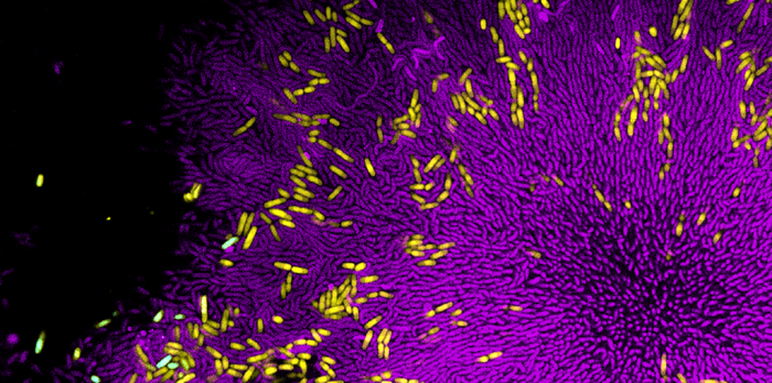 Peer-Reviewed PublicationIMAGE: COLONIES OF THE BACTERIUM V. CHOLERAE (PURPLE) INSULATE E. COLI (YELLOW) FROM ITS NATURAL PREDATOR. view more