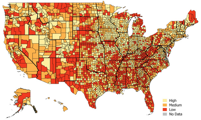 The TLI and factors associated with barriers to telemedicine were then extrapolated to the population using 2018 US Census data. This allowed the researchers to classify telemedicine literacy as high, medium, or low for more than 3,000 counties, parishes, and boroughs nationwide.