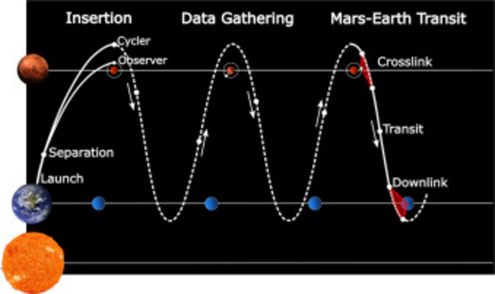 Woollands explained that the trajectories encounter two or more celestial bodies along their path and require a modest amount of propellant for correction maneuvers. After launch, the data mules use their own low-thrust propulsion system to inject into a cycler orbit and target subsequent flybys of Earth and Mars.