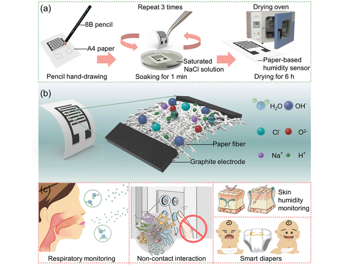 Research into wearable sensors has been gaining momentum because of their wide-ranging applications in medical health, disaster warning and military defense, Cheng explained. Flexible humidity sensors have become increasingly necessary in health care, for uses such as respiratory monitoring and skin humidity detection, but it is still challenging to achieve high sensitivity and easy disposal with simple, low-cost fabrication processes, he added.