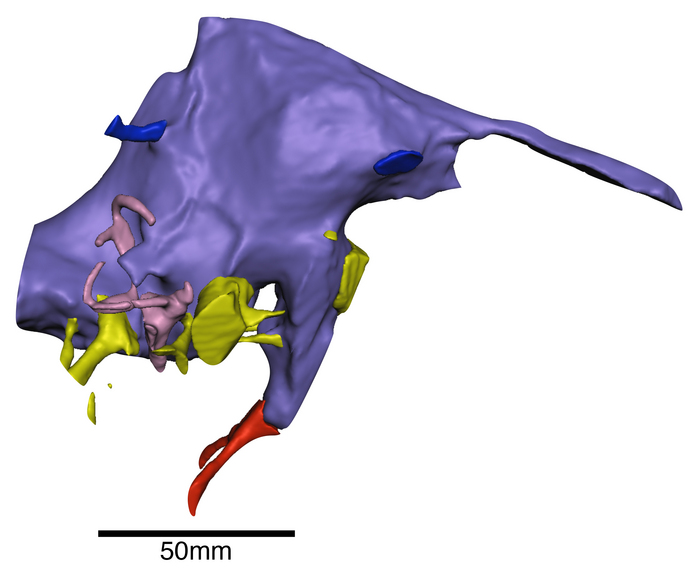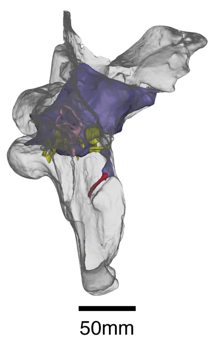 Three-dimensional reconstruction of the brain cavity (purple), cranial nerves (yellow), inner ear (pink) and blood vessels (red and blue) of the British spinosaurid Ceratosuchops inferodios. This predator likely had an unexceptional sense of smell and could hear low frequency sounds.