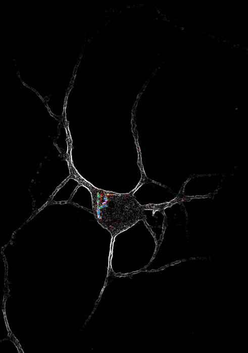 IMAGE: IMAGE OF A CORTICAL NEURON (WHITE) EXPRESSING SEROTONIN 2A (5-HT2A) RECEPTORS (MULTICOLOR). NEW WORK SHOWS THAT ENGAGING 5-HT2A RECEPTORS INSIDE CELLS, BUT NOT ON THE CELL SURFACE, ENCOURAGES CELL GROWTH AND FORMATION OF NEW CONNECTIONS. view more