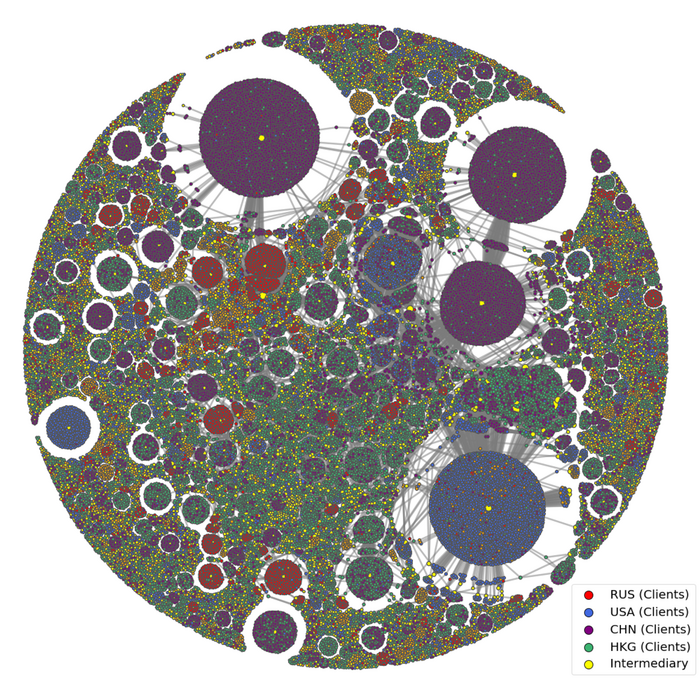 Peer-Reviewed PublicationIMAGE: THIS DATA VISUALIZATION OF NEARLY 80,000 FINANCIAL INTERMEDIARIES (YELLOW) AND THEIR ULTRA-WEALTHY CLIENTS IN RUSSIA (RED), CHINA (PURPLE), HONG KONG (GREEN), AND THE UNITED STATES (BLUE) SHOWS HOW WEALTH IS CONCENTRATED IN A FEW OFFSHORE WEALTH MANAGERS. RUSSIAN OLIGARCHS ESPECIALLY TEND TO RELY ON EXPERTS WITH SMALLER CLIENT LISTS TO ENSURE SECRECY, WHICH MAKES THEIR FORTUNES MORE VULNERABLE TO SANCTIONS AGAINST A FEW KEY INTERMEDIARIES. view more