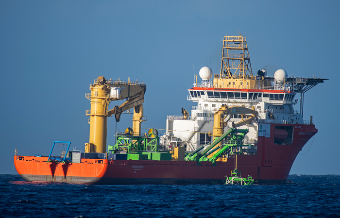 IMAGE: A VIEW OF THE NORMAND ENERGY DEPLOYING THE PATANIA II NODULE COLLECTOR VISIBLE (GREEN), SEEN FROM THE RAINBOW WARRIOR. THE VESSEL IS CHARTERED BY GLOBAL SEA MINERAL RESOURCES (GSR), A BELGIAN COMPANY RESEARCHING DEEP SEA MINING IN THE PACIFIC. THE COMPANY IS CURRENTLY TESTING MINING GEAR WITH THE AIM OF FUTURE COMMERCIAL EXTRACTION OF MINERALS FROM THE SEABED. view more
