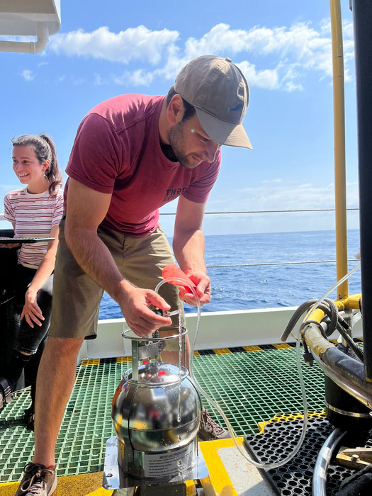 IMAGE: WOODS HOLE OCEANOGRAPHIC INSTITUTION (WHOI) SCIENTIST ALAN SELTZER COLLECTS A WATER SAMPLE IN THE NORTH ATLANTIC OFF THE COAST OF BERMUDA, MAY 2022. BY USING A TECHNIQUE DEVELOPED AT WHOI, SELT-ZER AND COLLEAGUES MADE ULTRA-PRECISE MEASUREMENTS OF DISSOLVED GAS ISOTOPES TO UNRAVEL THE PHYS-ICS OF GAS TRANSFER FROM THE ATMOSPHERE TO DEEP OCEAN. view more