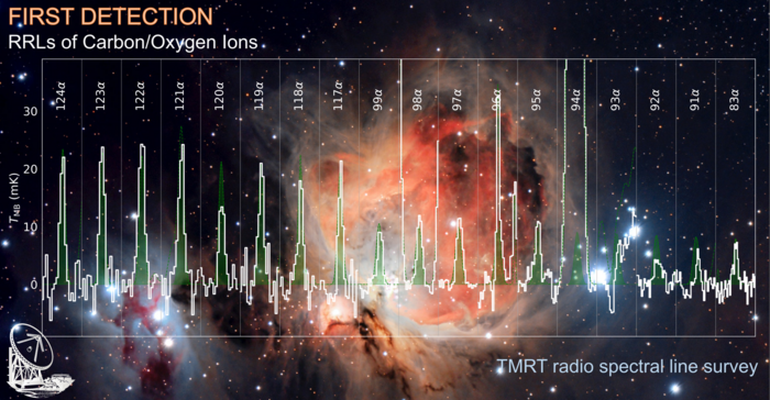 A research team from the Shanghai Astronomical Observatory (SHAO) of the Chinese Academy of Sciences has detected radio recombination lines (RRLs) of ions heavier than helium for the first time, using the TianMa 65-m Radio Telescope (TMRT). These lines were assigned to carbon and/or oxygen ions.
