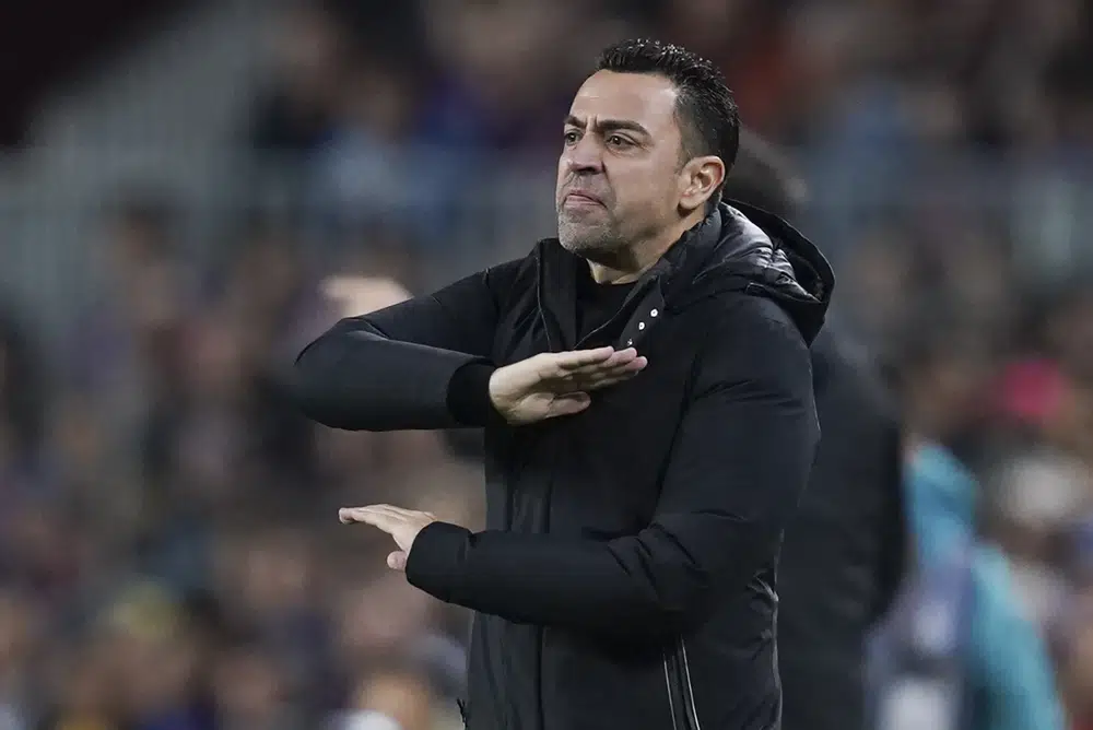 Barcelona's head coach Xavi Hernandez reacts during the Spanish La Liga soccer match between Barcelona and Real Madrid at Camp Nou stadium in Barcelona, Spain, Sunday, March 19, 2023.