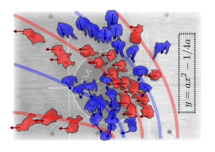 Parabolic lane formation captured in a human crowd experiment. The red group crosses the experimental arena ‘south to north’, and the blue group targets a narrow gate on the side. In agreement with the theory, the crowd spontaneously self-organizes into lanes shaped as (confocal) parabolas.