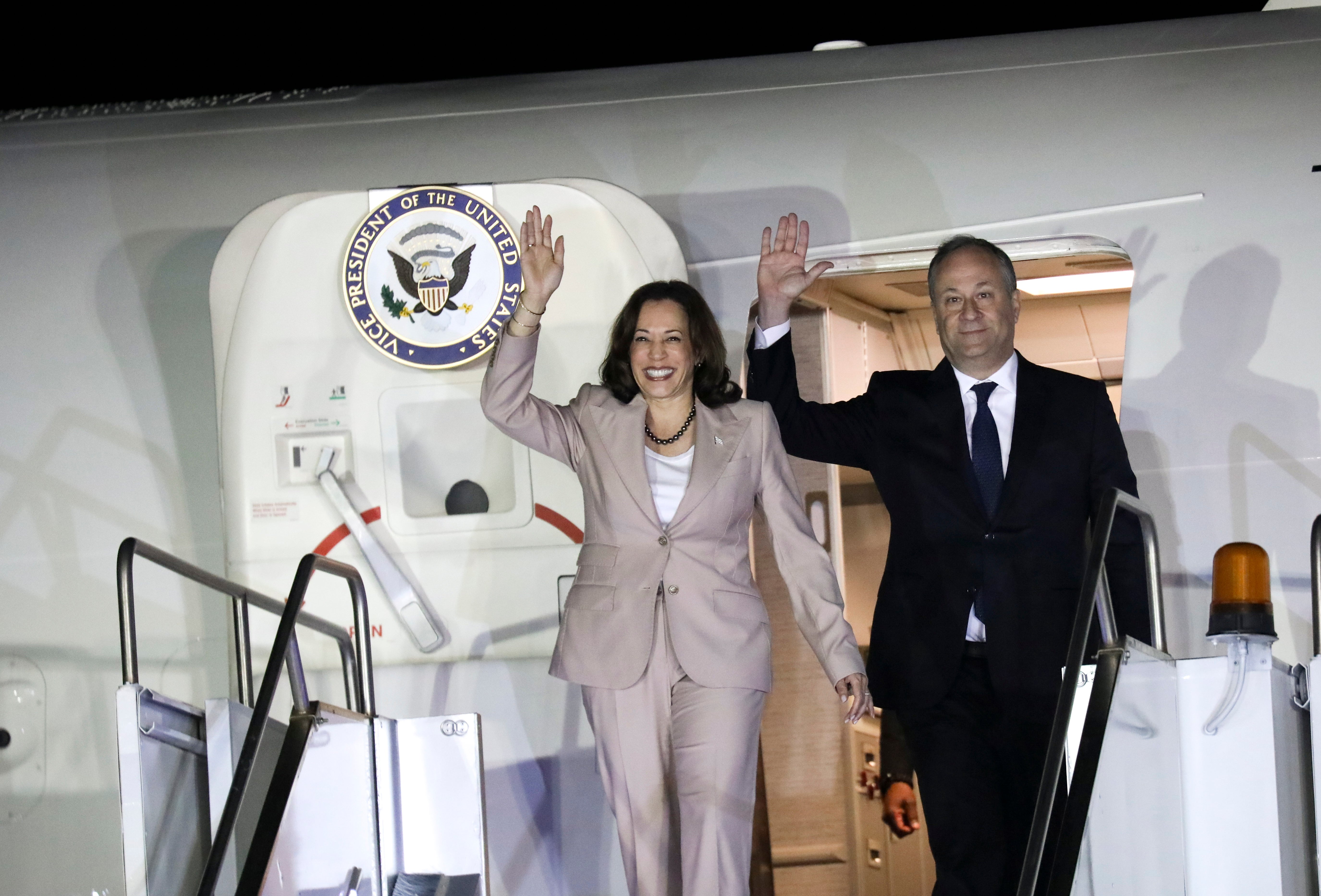 Harris arrived in Tanzania late Wednesday after spending three nights in Ghana. Much like at her first stop, she was greeted with music and dancing as she walked down a red carpet that was rolled out to Air Force 2. Some of the welcoming party wore shirts with Harris' face and skirts feature Hassan.