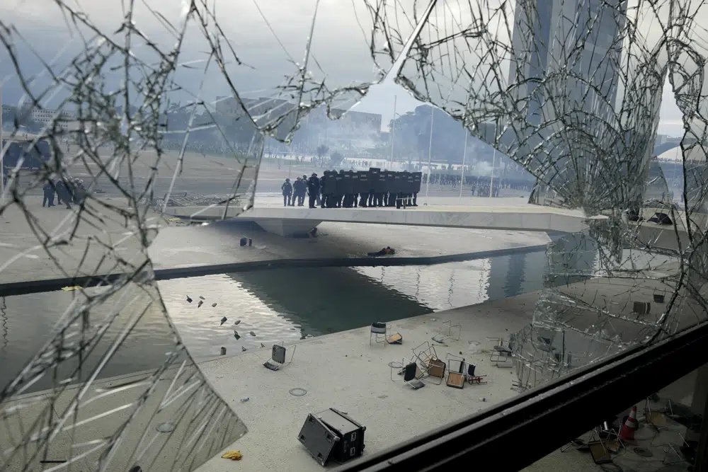 Police stand on the other side of a window at Planalto Palace that was shattered by supporters of Brazil's former President Jair Bolsonaro, after they stormed the official workplace of the President Luiz Inacio Lula da Silva, in Brasilia, Brazil, Jan. 8, 2023. Sources in the army and defense ministry, told The Associated Press they don't see any evidence of another uprising against Lula’s government in the near term, adding the high command has performed its regular duties without question. (AP Photo/Eraldo Peres, File)
