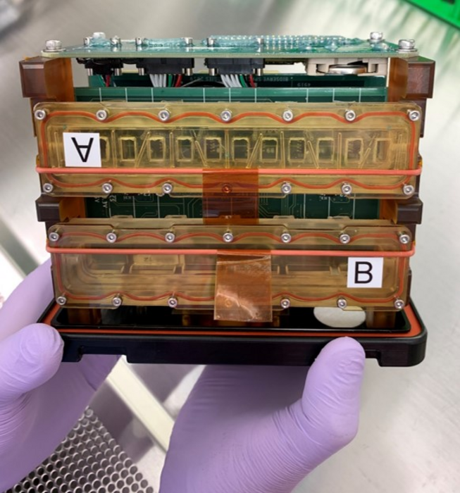 Groups of cardiomyocytes form tissue that can be strung between two posts, one flexible and one stiff. The flexible post has an embedded magnet and, when placed over sensors, allows for collection of information on tissue contraction. The chamber enclosing the tissue is sealed so that liquid media feeding the tissue doesn’t float away in space. These tissue chambers are then loaded into so-called plate habitats with the magnetic sensors located beneath the tissue. The experimental payload consists of two of these plate habitats, which measure about 7 inches long, 5 inches tall and 4 inches wide.