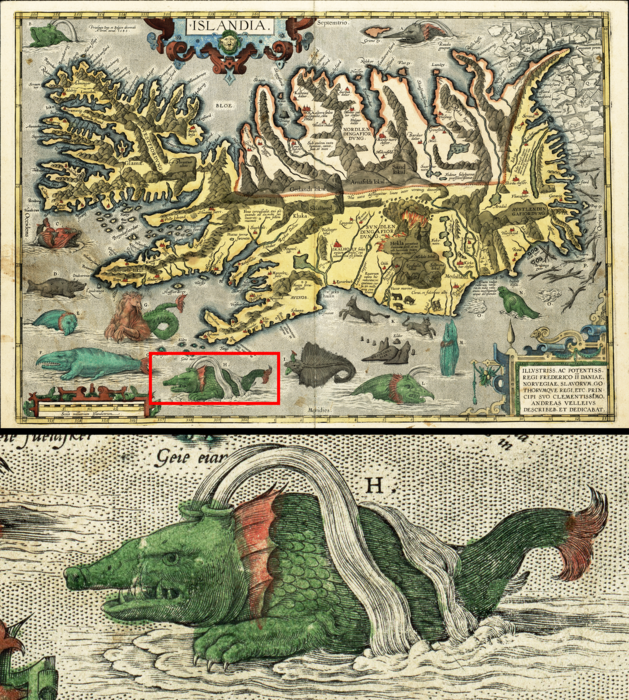 Above: Ortelius's 1658 map of Iceland showing various mythological sea creatures. Below, a detail of a sea creature labelled H, ‘the greatest of whales’ which could not chase fish but caught them through cunning