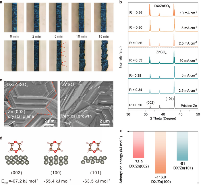 (a) The in-situ optical microscopic comparison of the deposited Zn anode surface in the ZnSO4 electrolyte and DX/ZnSO4 electrolyte. (b, c) The XRD patterns and SEM images show the (002) texture in the DX/ZnSO4 electrolyte. (d, e) The adsorption energy comparison.