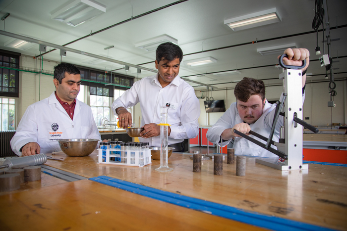 IMAGE: PAVAN AKULA, CENTER, ASSISTANT PROFESSOR OF CIVIL ENGINEERING IN THE OSU COLLEGE OF ENGINEERING, AND STUDENTS ASHISH BASTOLA, LEFT, AND NICHOLAS PETERSEN IN AKULA'S LAB. AKUNA IS PART OF A A THREE-YEAR, $540,000 GRANT FROM THE U.S. DEPARTMENT OF ENERGY TO EXPLORE CAPTURING CARBON DIOXIDE FROM INDUSTRIAL EMISSIONS AND SEQUESTERING IT IN A MINERALIZED FORM IN 3D-PRINTED BUILDING MATERIALS. PHOTO BY JOHANNA CARSON, OSU COLLEGE OF ENGINEERING. view more