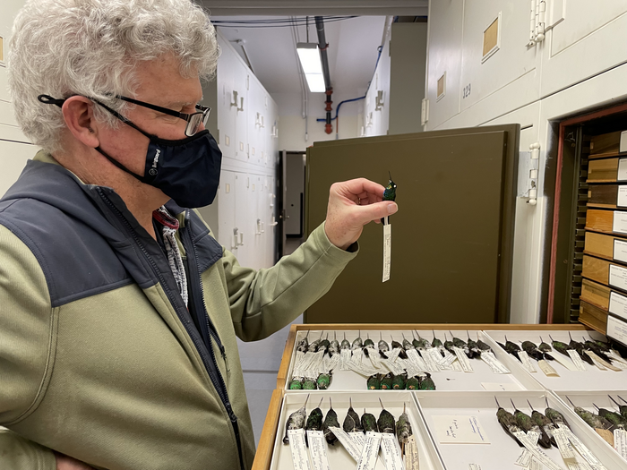 Field Museum senior research scientist Chad Eliason with hummingbirds in the museum's collections.