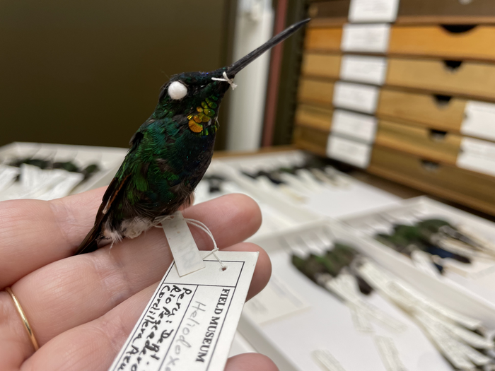 When Bates and colleagues gathered more data about the specimen in the Field Museum’s Pritzker DNA Lab, however, the results surprised everyone. “We thought it would be genetically distinct, but it matched Heliodoxa branickii in some markers, one of the pink-throated hummingbirds from that general area of Peru,” says Bates. If it was H. branickii, it didn’t make sense for the bird to have gold throat feathers; in the hummingbird family, it’s rare for members of the same species to have dramatically different throat colors.