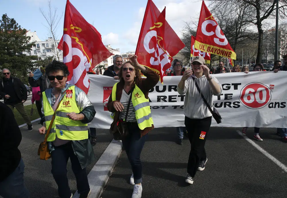 People demonstrate in Bayonne, southwestern France, Wednesday, March 15, 2023. Opponents of French President Emmanuel Macron's pension plan are staging a new round of strikes and protests as a joint committee of senators and lower-house lawmakers examines the contested bill.