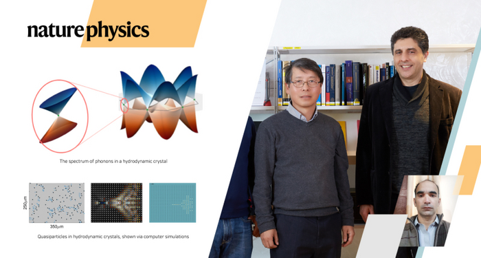 The large population of particles coupled in pairs hinted that these are the long-lived elementary excitations in the system — its quasiparticles. This hypothesis was proven right when the researchers simulated a large two-dimensional crystal made of thousands of particles and examined its motion (Figure 1 Right). The hydrodynamic forces among the particles make the crystal vibrate, much like the thermal phonons in a vibrating solid body.