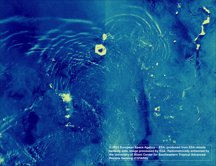 This image was captured by the Sentinel-1A synthetic aperture radar (SAR) satellite in VV polarization over the Tonga island archipelago on 14 January 2022 at 17:08 UTC, 13 hours after the initial eruption, and relayed to the University of Miami Rosenstiel School’s Center for Southeastern Tropical Advanced Remote Sensing (CSTARS) facility in southwest Miami-Dade County. CSTARS performed an enhancement of the image to delineate clearly the circular wave patterns, likely internal waves, emanating from the volcano (large, bright spot on the left bottom) and diffracting around the islands and coral reefs of the Tonga archipelago as well as interacting with each other.