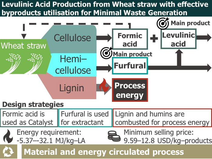 In response, this research team has developed a process that minimizes the supply of external utilities by reusing by-products produced during the production of LA from biomass as much as possible while still being able to supply all of the required energy from the combustion of by-products. Specifically, by reusing the by-product formic acid as a catalyst, using a chemical called furfural obtained from biomass as an extraction solvent to purify LA, and combusting the solid by-products, the total process energy was reduced and supplied by itself. Furthermore, it was found that the excess solid by-products could be effectively utilized for building materials and other purposes. We also found that using river water could provide all the cooling needed. The amount of river water is less than 0.12% of the minimum annual volume flow in the middle reaches of the Naka River in Tochigi Prefecture, located in a rural area of Japan.